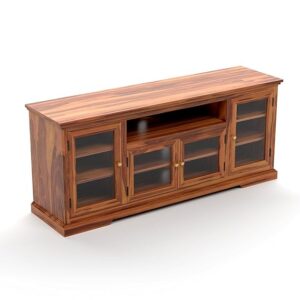 - The well-constructed stand, durable and versatile when it comes to TV size and weight. Each piece is unique as it is individually. The table top comfortably accommodates your television and the shelf is large enough to house your media